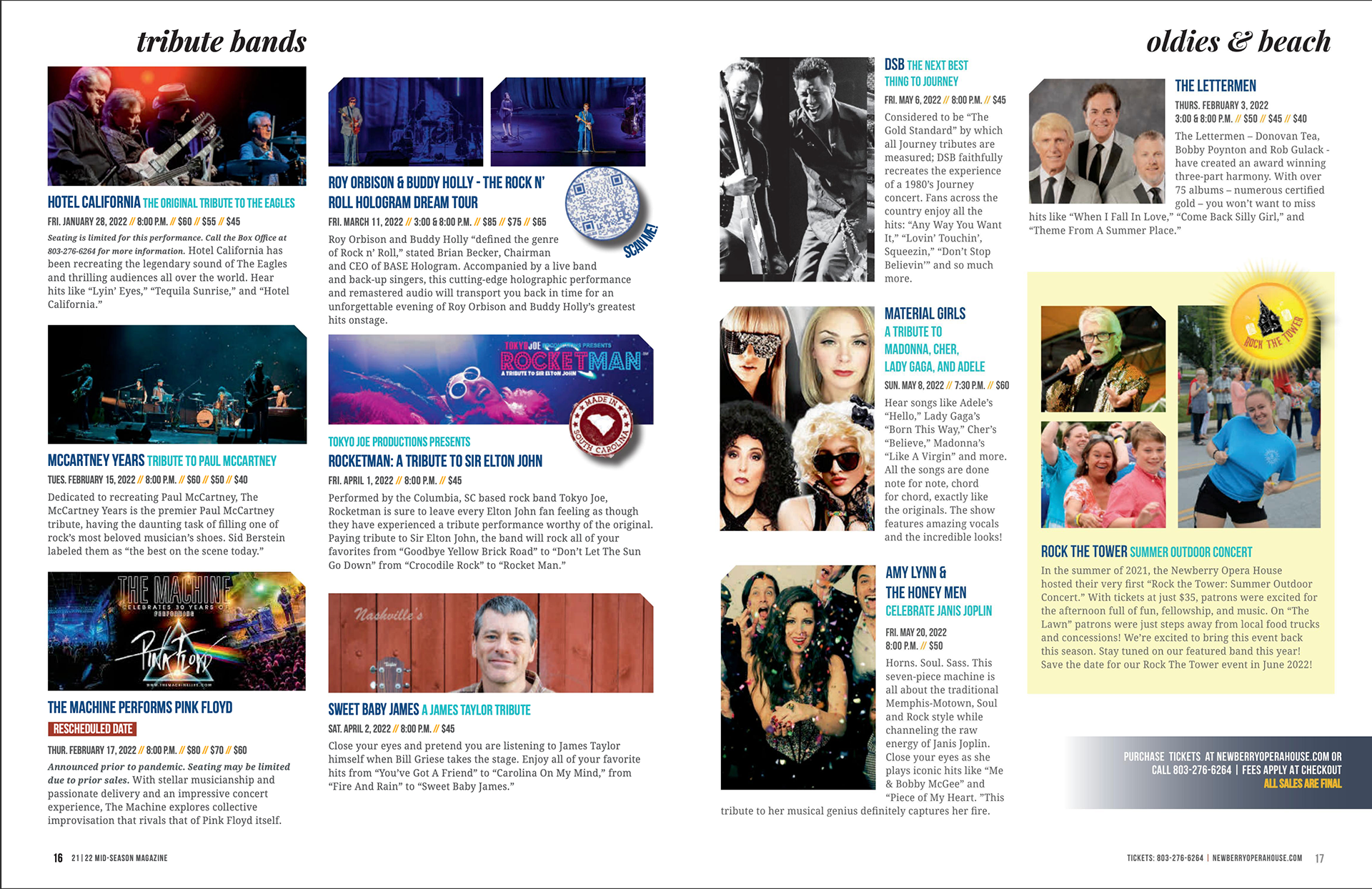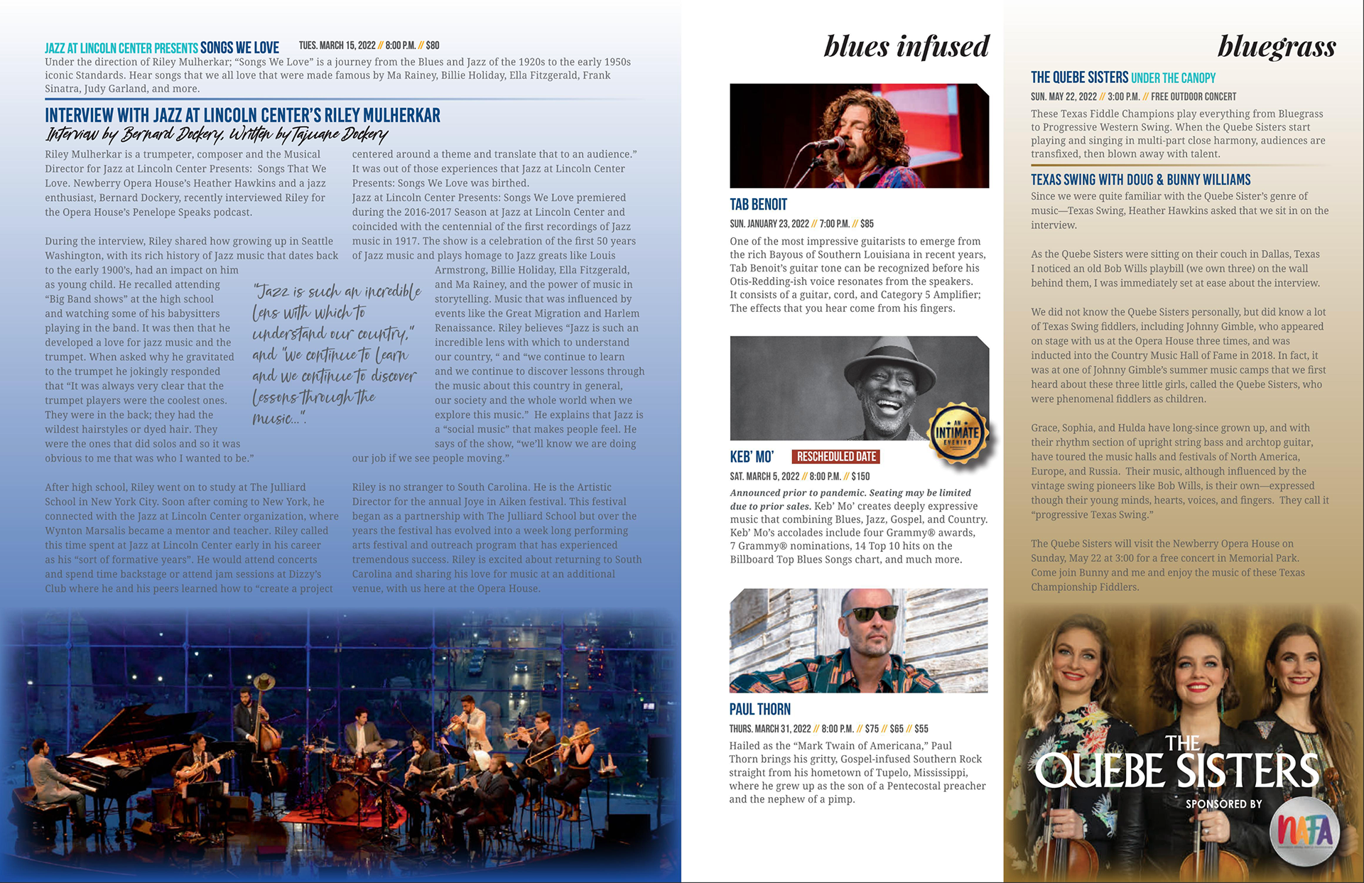 Publication design of the Newberry Opera House's Mid-Season Magazine. The Mid-Season Magazine highlights their donors and the remaining shows of the season.