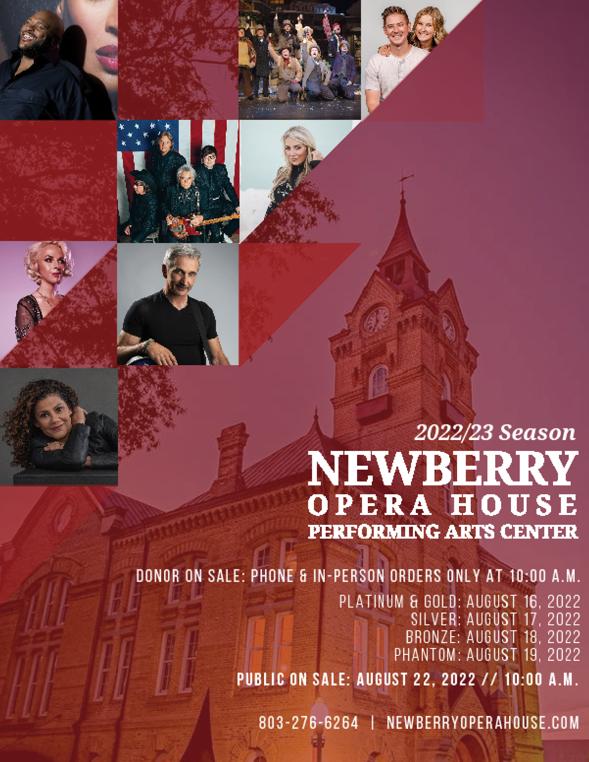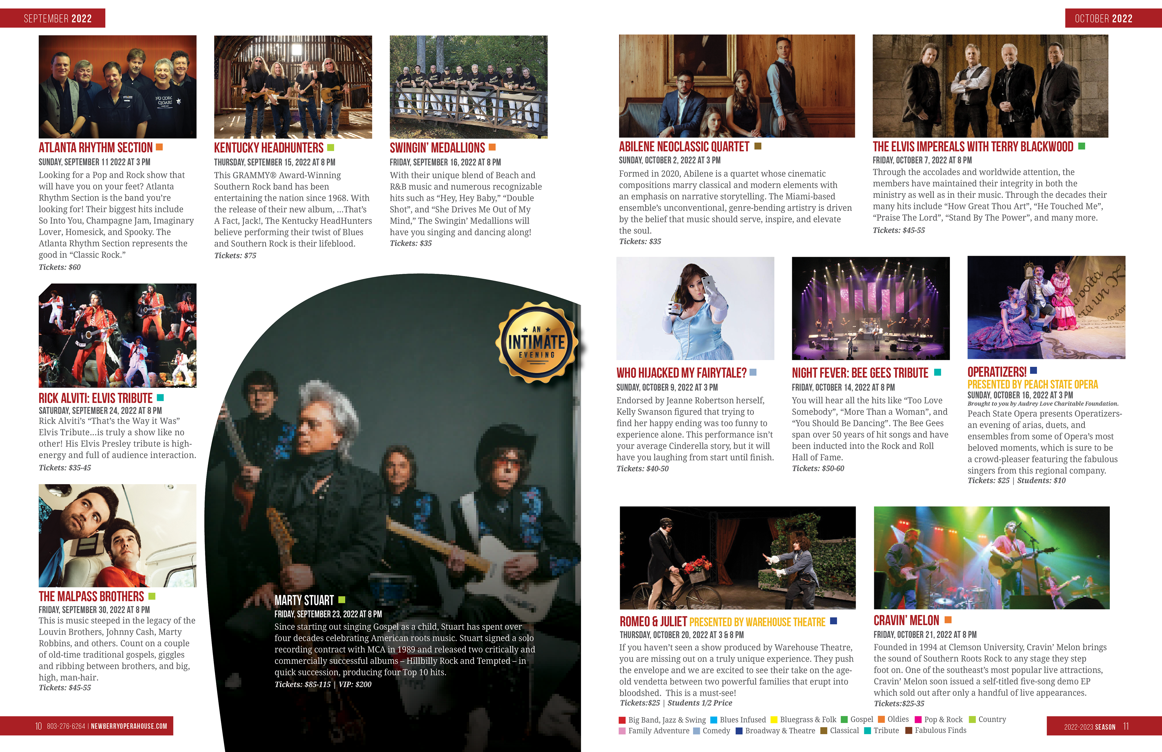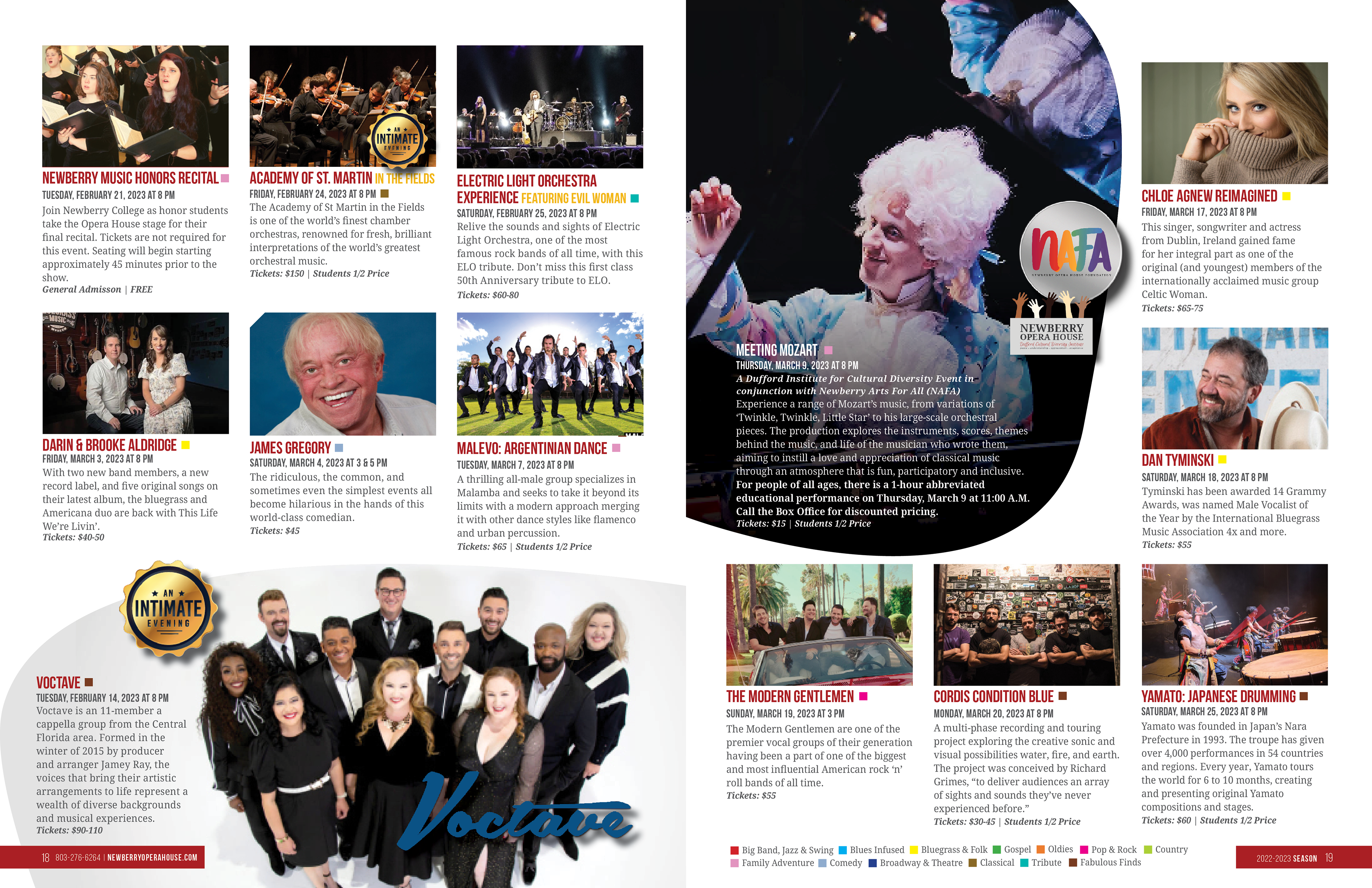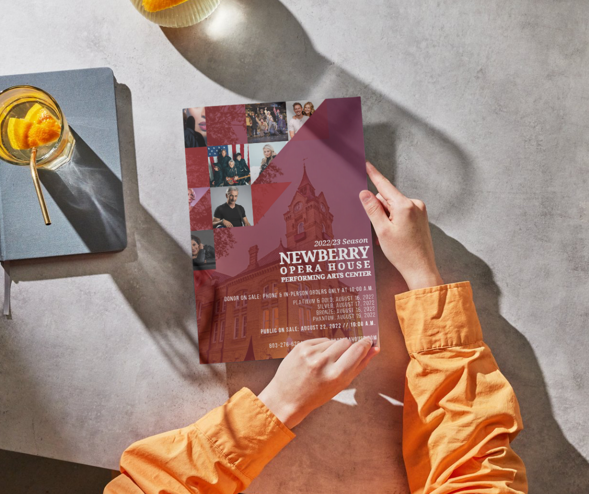 Publication design of the Newberry Opera House's Season Brochure announcing the upcoming performances.